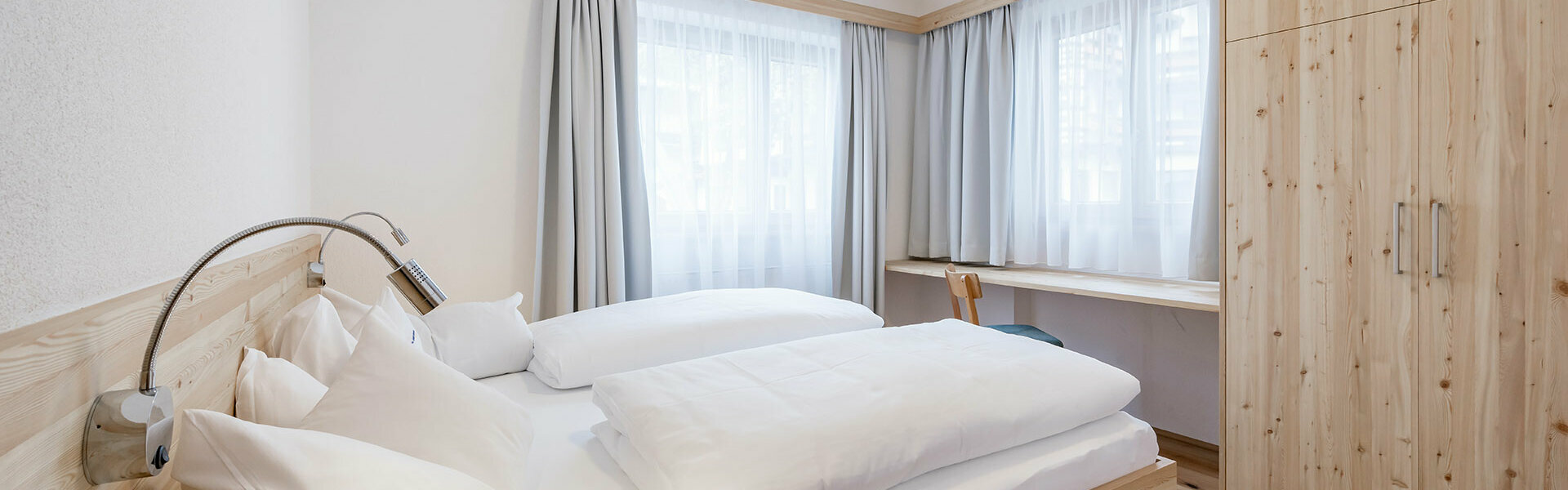 Wohnen Sie in unseren gemütlichen Doppelzimmern „Sonnenlicht“ im Zentrum von Sölden. Ein drittes Bett ist auf Anfrage möglich.